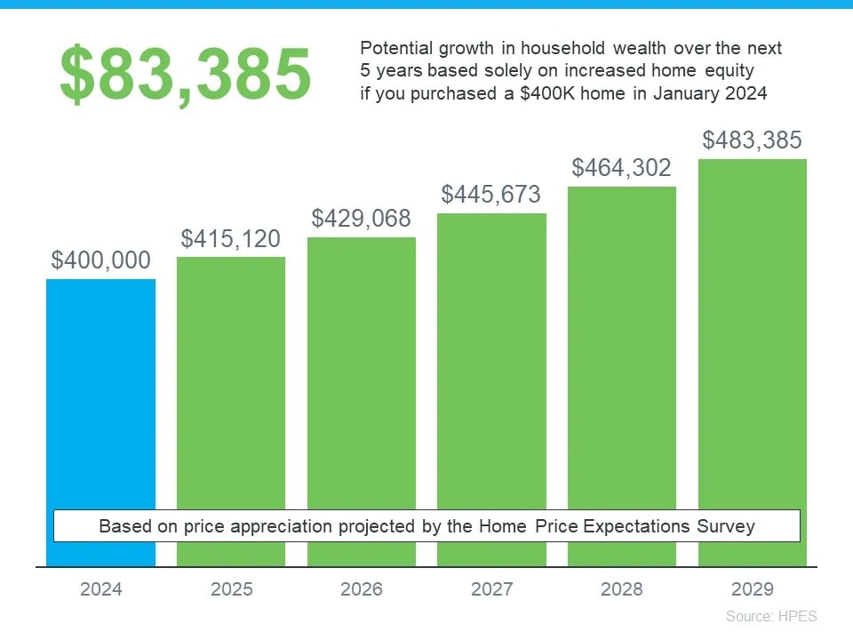 In this example, imagine you bought a home for $400,000 at the start of this year. Based on these projections, you could end up gaining over $83,000 in household wealth over the next five years as your home grows in value.